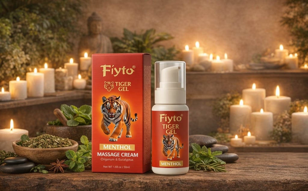These botanicals are often combined in massage formulations designed to create a refreshing yet comforting sensory experience, such as Tiger Gel Massage Cream, which blends eucalyptus oil, origanum oil, menthol, and camphor for daily body care.